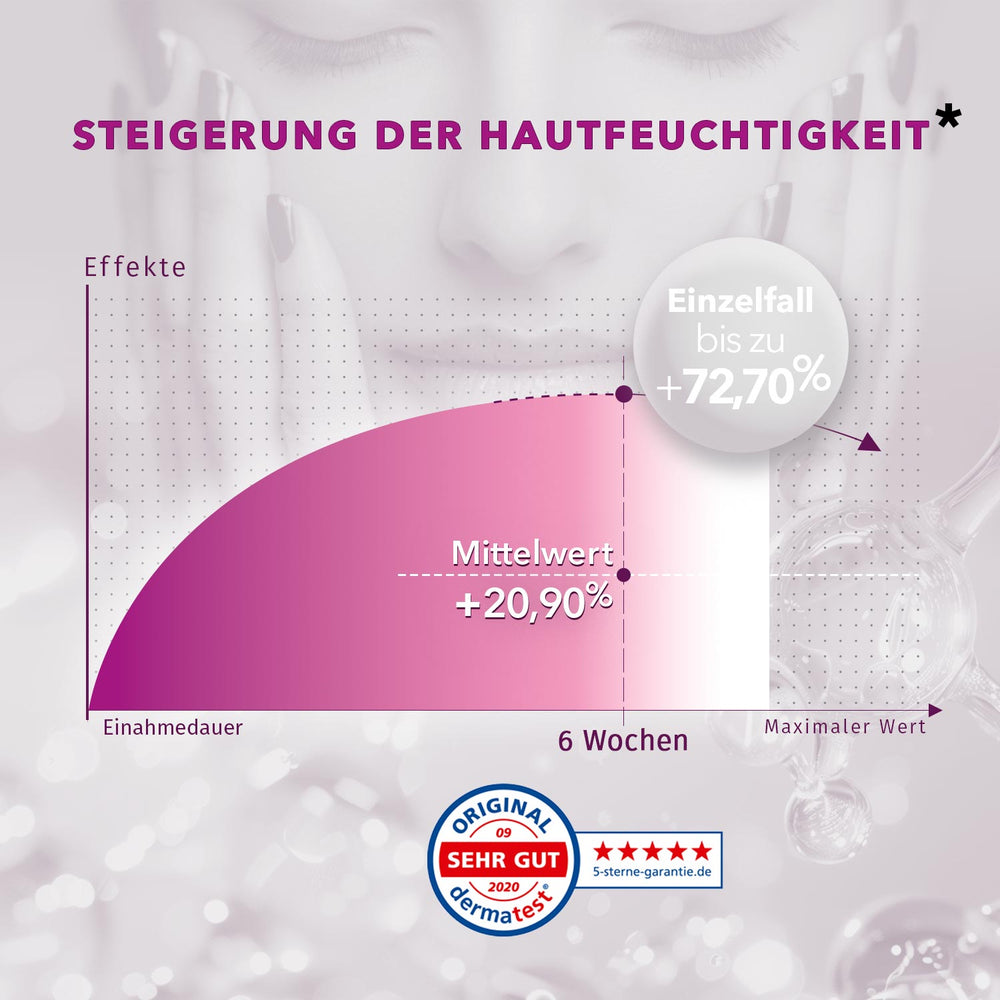 Die in smartsleep® BEAUTY enthaltenen Inhaltsstoffe tragen zu einer normalen Kollagenbildung für eine normale Funktion der Haut bei, sowie zur Erhaltung von normalem Bindegewebe bei. In einer dermatologischen Anwendungsstudie (n=20) zeigte sich nach 6 Wochen Einnahme von smartsleep® Beauty eine Steigerung der Hautfeuchtigkeit von durchschnittlich +20,90% – mit individuellen Zunahmen bis zu +72,70%.