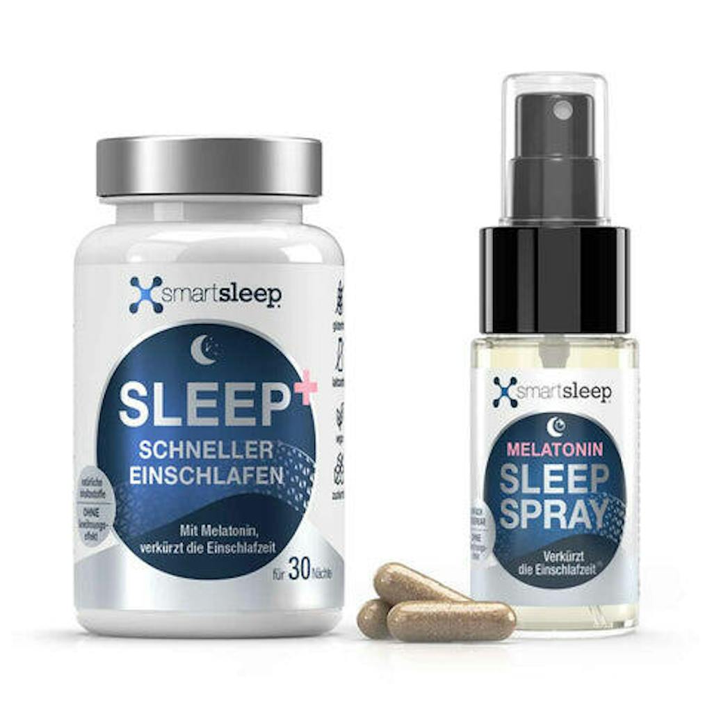 Nuestros dos bestsellers en los ahorros Bundle. El smartsleep® SLEEP SPRAY ayuda a quedarse dormido más rápido. Con la hormona del sueño melatonina*, extracto de flores de pasión y aroma a menta fresca. Simplemente dosable y práctico para el hogar y sobre la marcha.