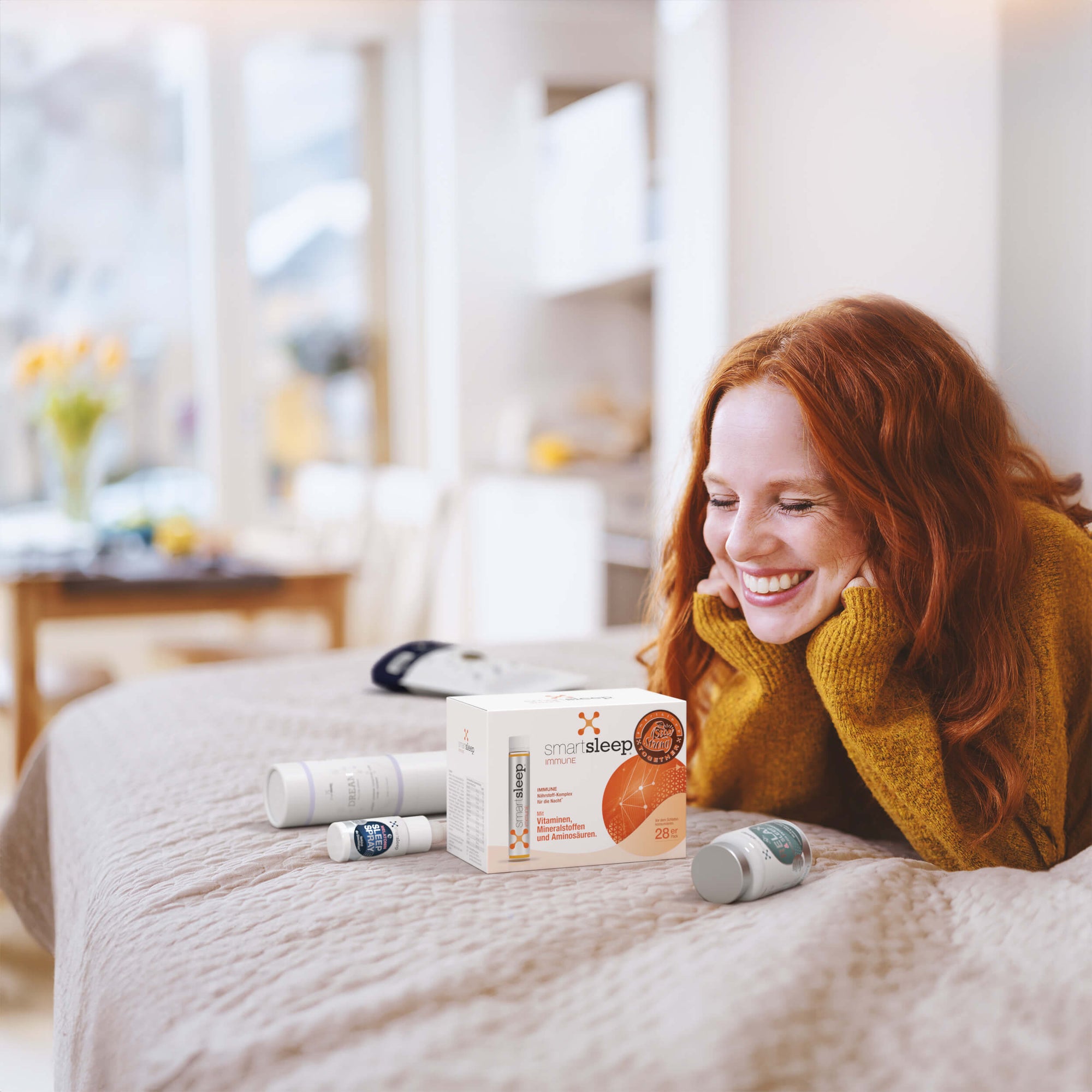 L'innovant Complexe de nutriments immunitaires pour la nuit. smartsleep® IMMUNE soutient votre système immunitairelorsqu'il fonctionne à plein régime et vous fournit surtout la nuit avec de nombreux Vitamines, acides aminés et oligo-éléments. Entre autres choses, Vitamines A, B6 et C, ainsi que zinc, sélénium et manganèse ton Défense immunitaire, division cellulaire et synthèse d'ADN et protégez vos cellules contre stress oxydatif – pour un réveil vital le matin.